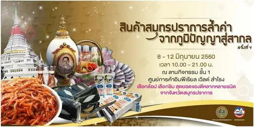 พบกันอีกครั้งกับกิจกรรมดีๆที่สรรหา คัดสรร สิ่งดีๆมาให้ทุกท่าน เลือกชิม เลือกชม เลือกช้อป ของคุณภาพติดไม้ติดมือกับบ้านแล้วที่ผ่านมาได้จัดมาแล้วถึง 3 ครั้ง และครั้งนี้ ทางสำนักงานพาณิชย์จังหวัดสมุทรปราการจึงขอเชิญชวนเที่ยวงาน “ สินค้าสมุทรปราการล่ำค่า จากภูมิปัญญาสู่สากล ” ครั้งที่ 4 ที่กำลังจะเกิดขึ้น วันที่ 8 - 12 มิถุนายน 2560 เวลา 10.00-21.00 น.