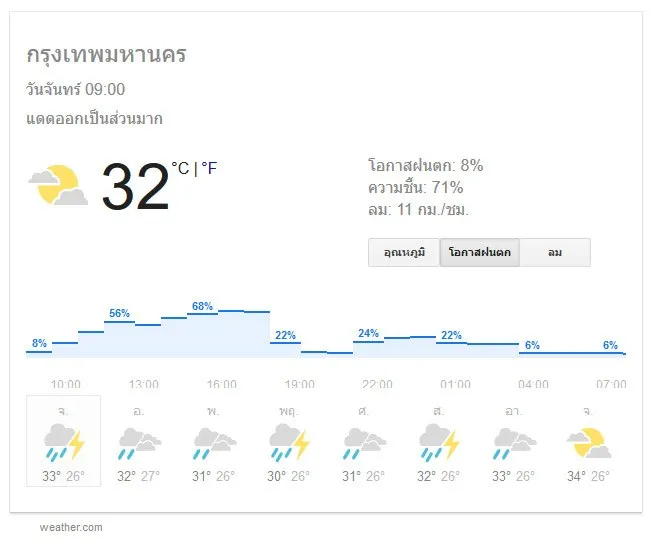 กรุงเทพมหานครและปริมณฑล มีฝนฟ้าคะนอง ร้อยละ 60 ของพื้นที่ อุณหภูมิต่ำสุด 24-26 องศาเซลเซียส อุณหภูมิสูงสุด 32-34 องศาเซลเซียส ลมตะวันตกเฉียงใต้ ความเร็ว 15-30 กม./ชม.