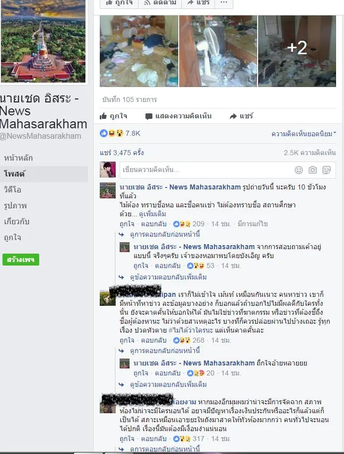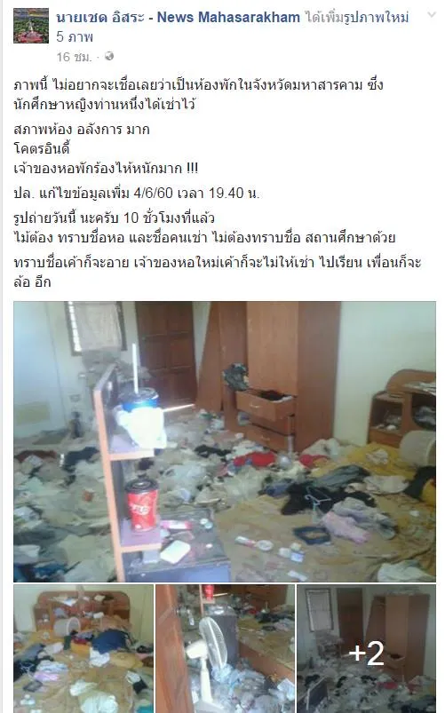 เมื่อ วันก่อนที่ผ่านมา ทางเฟซบุ้คคุณ นายเชด อิสระ - News Mahasarakham ได้โพสต์ รูปห้องพักนักศึกษาแห่งหนึ่ง ในจังหวัดมหาสารคาม ว่ามีขยะเกลือ่นกลาดเต็มไปหมด หาทางเดินไม่เจอ พร้อมบอกว่า เป็นภาพถ่าย เมื่อวันที่ 4/5/2560 แถมระบุอีกว่าเป็นหอพักหญิงด้วย ทำเอาชาวเน็ทต่างตะลึงไปตามๆกัน และแชร์กันไปอย่างมากมาย
