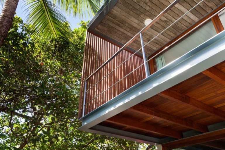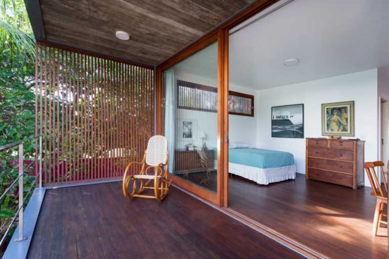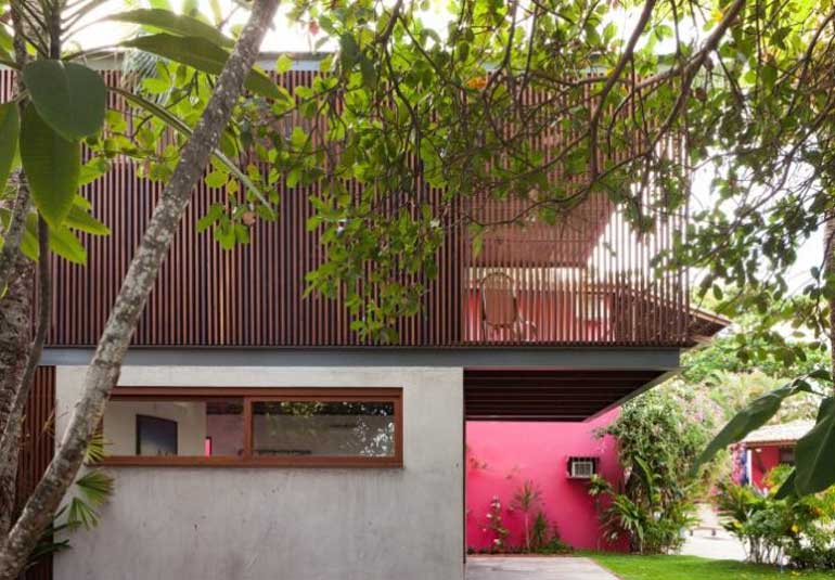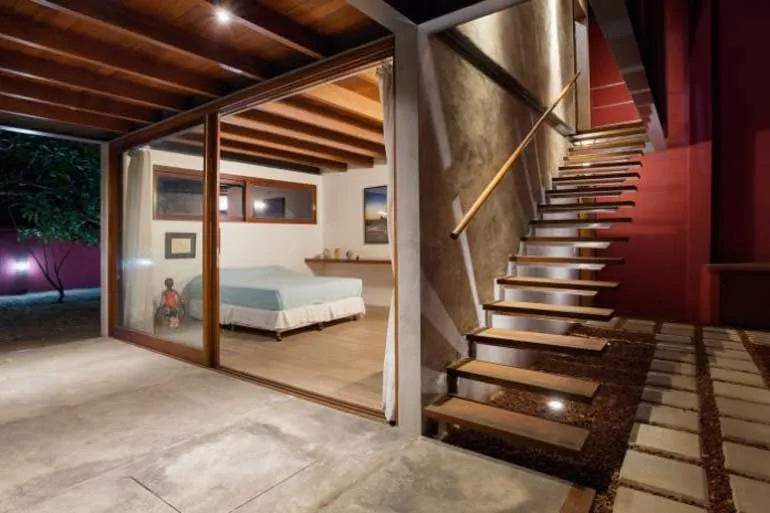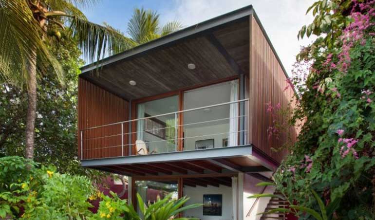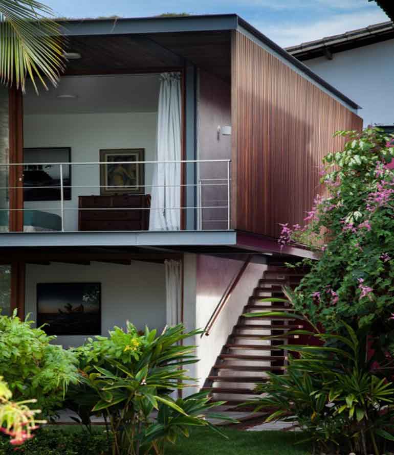 หลังนี้จัดว่าน่าอยู่มากๆ สำหรับ เกสต์เฮาส์กลางสวน ที่ล้อมรีอบด้วยบรรยากาศร่มรื่นทั้งวัน เพียบพร้อมไปด้วย พรรณไม้นานาชนิด เป็นแบบที่หลายๆ คนฝันถึงเลยทีเดียว ตัวบ้านได้รับการออกแบบให้เป็นคูหารูปทรงสี่เหลี่ยมง่ายๆ มีโครงสร้างหลักเป็นเหล็ก พร้อมกล่องยื่นที่โดดเด่น ตกแต่งผนังด้วยงานไม้ ติดสลับเป็นช่องแสงไปกับผนังคอนกรีต และใช้กระจกบานใหฐ่ เพื่อให้ได้แสงจากธรรมชาติในตัวบ้าน