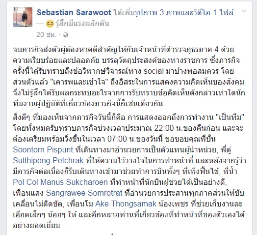จบภารกิจส่งตัวผู้ต้องหาคดีสำคัญให้กับเจ้าหน้าที่ตำรวจภูธรภาค 4 ด้วยความเรียบร้อยและปลอดภัย บรรลุวัตถุประสงค์ของทางราชการ ซึ่งภารกิจครั้งนี้ได้รับทราบถึงข้อวิพากษ์วิจารณ์ทาง social มาบ้างพอสมควร โดยส่วนตัวแล้ว "เคารพและเข้าใจ" ถึงอิสระในการแสดงความคิดเห็นของสังคม จึงไม่รู้สึกได้รับผลกระทบอะไรจากการรับทราบข้อคิดเห็นดังกล่าวเท่าใดนัก ทีมงานผู้ปฏิบัติที่เกี่ยวข้องภารกิจนี้ก็เช่นเดียวกัน