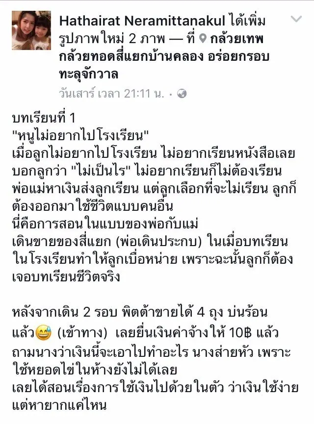 คุณแม่สอนบทเรียนให้กับลูกสาว เมื่อเธอไม่อยากไปโรงเรียน คุณแม่ไม่ดุไม่ด่าหรือบังคับ แต่ปล่อยให้เธอไปยืนขายกล้วยทอดกลางสี่แยก และสอนให้เธอเรียนรู้ว่าหากไม่เรียนหนังสือ เธอจะเจอกับอะไรบ้าง โดยคุณแม่ได้โพสท์เฟซบุ๊คที่ชื่อHathairat Neramittanaku โดยโพสท์แชร์เรื่องราวระบุว่า