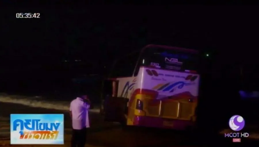นายทวีโชคชัย แปลงไธสง อายุ 49 ปี คนขับรถทัวร์ บอกว่า ขณะพาลูกทัวร์มากินอาหารทะเลที่ร้านภายในซอยดังกล่าว ซึ่งเป็นทางลาดชัน ได้แตะเบรกเพื่อหยุดรถ แต่เบรกไม่อยู่ จนเฉี่ยวรถกระบะที่จอดข้างทาง จึงประคองพวงมาลัยให้พุ่งเหินลอยจากถนนลงไปที่บริเวณชายหาด แต่รถก็ยังไม่หยุด ไถลลงไปในทะเลดังกล่าว ส่วนสาเหตุคาดว่าน่าจะเกิดจากรถทัวร์เบรกแตก แต่จะเกิดเพราะใช้งานหนักเกินไป หรือตัวรถไม่ได้มาตรฐาน ต้องรอตรวจสอบอีกครั้ง. - สำนักข่าวไทย