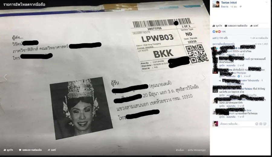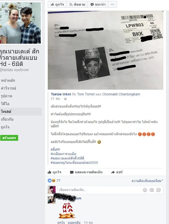 วันที่ 6/62560 ที่ผ่านมา ทาง เฟซบุ๊ก คุณนายเตเต้ สักคิ้วลายเส้นแบบ Hd - 6มิติ ได้โพสต์ภาพพัสดุ ที่ถูกส่งมา แต่สิ่งที่่แปลกไปคือ ทางผู้ส่งได้แนบ รูปถ่ายผู้รับมาด้วย ทำเอาคนรับ ก็ออกมาโพสเฟสบุ้คทำนองว่าไม่เห็นใจคนรับบ้างเลย กลายเป็นที่ฮือฮา กดไลค์กดแชร์กันมากมายในโลกโซเชียล