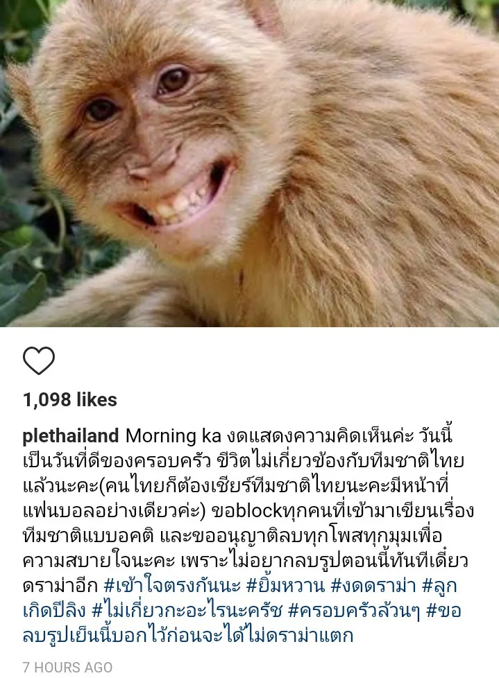 "งดแสดงความคิดเห็นค่ะ วันนี้เป็นวันที่ดีของครอบครัว ชีวิตไม่เกี่ยวข้องกับทีมชาติไทยแล้วนะคะ(คนไทยก็ต้องเชียร์ทีมชาติไทยนะคะมีหน้าที่แฟนบอลอย่างเดียวค่ะ) ขอblockทุกคนที่เข้ามาเขียนเรื่องทีมชาติแบบอคติ และขออนุญาติลบทุกโพสต์ทุกมุมเพื่อความสบายใจนะคะ เพราะไม่อยากลบรูปตอนนี้ทันทีเดี๋ยวดราม่าอีก #เข้าใจตรงกันนะ #ยิ้มหวาน #งดดราม่า #ลูกเกิดปีลิง #ไม่เกี่ยวกะอะไรนะครัช #ครอบครัวล้วนๆ #ขอลบรูปเย็นนี้บอกไว้ก่อนจะได้ไม่ดราม่าแตก"