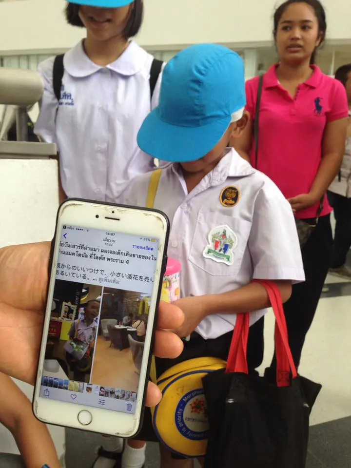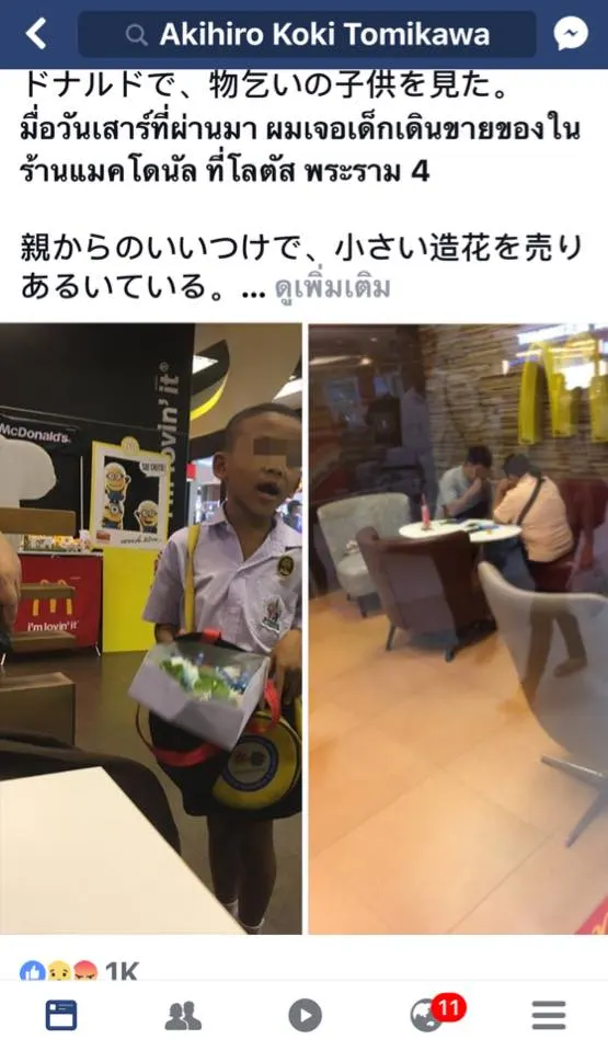 เฟซบุ๊กชื่อ "Akihito Loki Tomikawa" โพสต์ภาพ ด.ช.จิ๋ว มาขายดอกไม้ ขณะรับประทานอาหารที่ร้านอาหารในห้างสรรพสินค้าแห่งหนึ่งในกรุงเทพฯ และเป็นการบังคับเด็กให้มาขาย