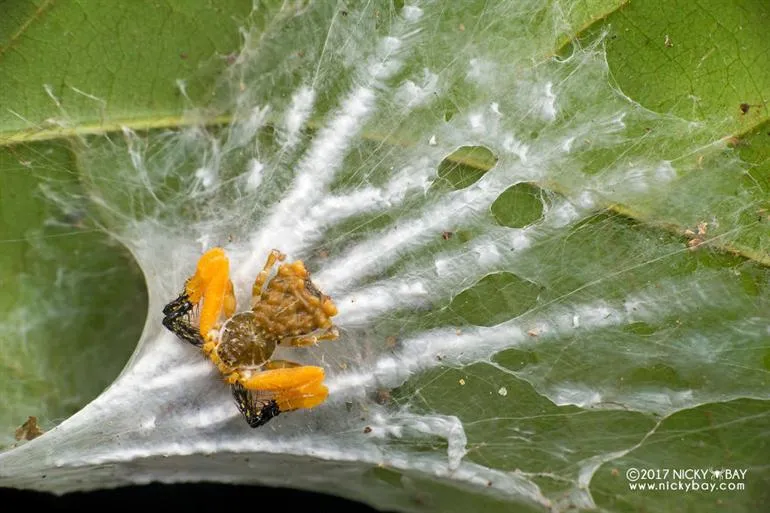 นี่คือภาพของ bird dropping spider (Celaenia excavata) หรือที่เรียกกันว่า แมงมุมขี้นก หนึ่งในแมงมุมหายากสายพันธุ์หนึ่งที่ช่างภาพอย่าง Nicky Bay ต้องลงทุนลงแรงถึง 7 ปีในการตามถ่ายภาพพวกมัน สำหรับ แมงมุมขี้นก เป็นแมงมุมขนาดเล็กที่พบได้ในแถบอเชียตะวันออกเฉียงใต้เป็นส่วนใหญ่โดยภาพที่ Bayถ่ายมาหใ้เราชมนี้ส่วนใหญ่อยู่ในสิงคโปร์ แมงมุมขี้นกชอบอาศัยอยู่ตามกองเศษไม้เล็กๆ ใบไม้ เพื่ออำพรางตัวดักซุ่มเหยื่อที่จะเผลอเดินผ่านความตายเข้ามา