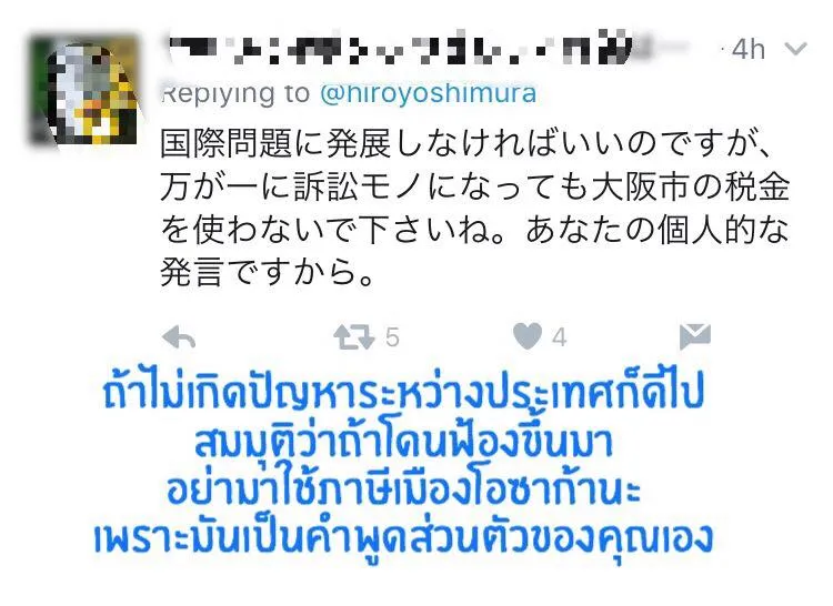 ทำให้คนญี่ปุ่นหลายคนเอง ก็ไม่พอใจที่ท่านผู้ว่าฯทวิตไปอย่างนั้น บางคนทวิตตอบกลับไปว่า "อย่าพูดจาเสียมารยาทแก่คนไทย" บางคนก็บอกว่า "ดูยังไงก็ไม่เหมือนฟูนาชี่" "ถ้าโดนฟ้อง อย่ามาใช้ภาษีเมืองโอซาก้านะ" ฯลฯ