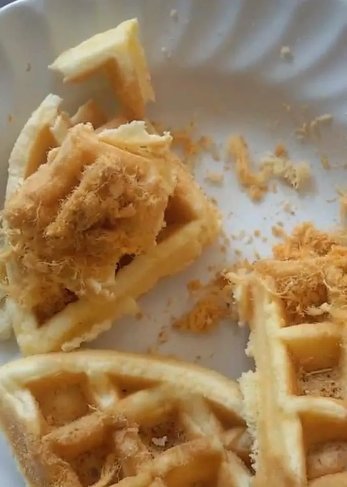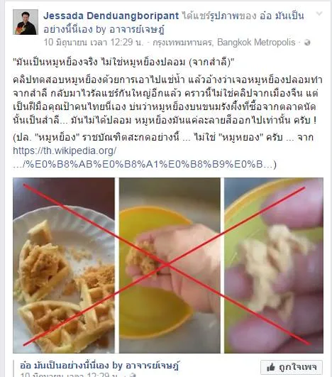 " เค้าบอกว่าหมูหยองปลอมทำมาจากสำลี " หนุ่มโพสท์เฟซบุ๊คเล่าว่า ซื้อขนมรังผึ้ไส้หมูหยองมาจากตลาด กินไป 1 คำรู้สึกว่าเหมือนสำลี เลยลองเอามาทดลองอย่างที่คนอื่นเข้าทำ เลยเอาหมูหยองไปแช่น้ำ ปรกฏว่าจากหมูหยองกลายเป็นสำลีอย่างที่คิดไว้จริงๆ อย่างนี้จะไปเชื่อใจใครได้อีก