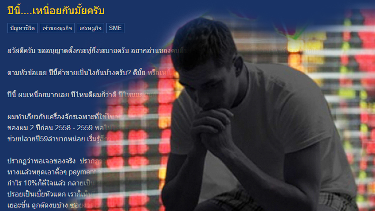 ผมไม่เคยโทษเศรษฐกิจนะ เพราะทำงานมาเป็นสิบปี ไม่เคยได้ยินว่าปีไหนเศรษฐกิจดีจากคนค้าขาย ได้ยินก็จากรัฐบาลอย่างเดียวว่าดีๆ ผมว่าจะดีไม่ดี มันอยู่ที่คนทำว่าเราปรับตัวได้ขนาดไหน แต่ตอนนี้ไม่รู้จะทำยังไงจริงๆ จนมานั่งบ่นในพันทิพ