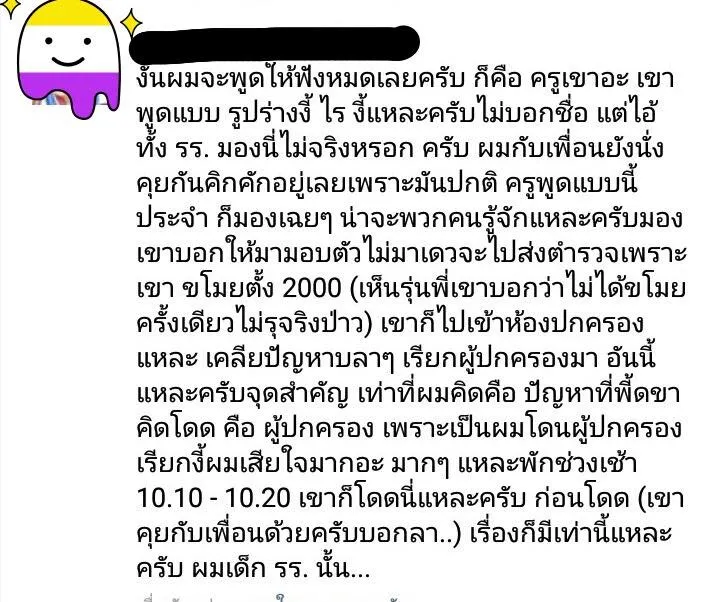 นักเรียนในโรงเรียนเด็กโดดตึก ขอชี้แจงสื่อปั่นมั่วจนทำลายครู เหตุการณ์ที่แท้จริงเป็นแบบนี้ โดยโพสท์ผ่านเพจแหม่โพธิ์ดำให้ช่วยเป็นสื่อกลางโดยระบุว่า