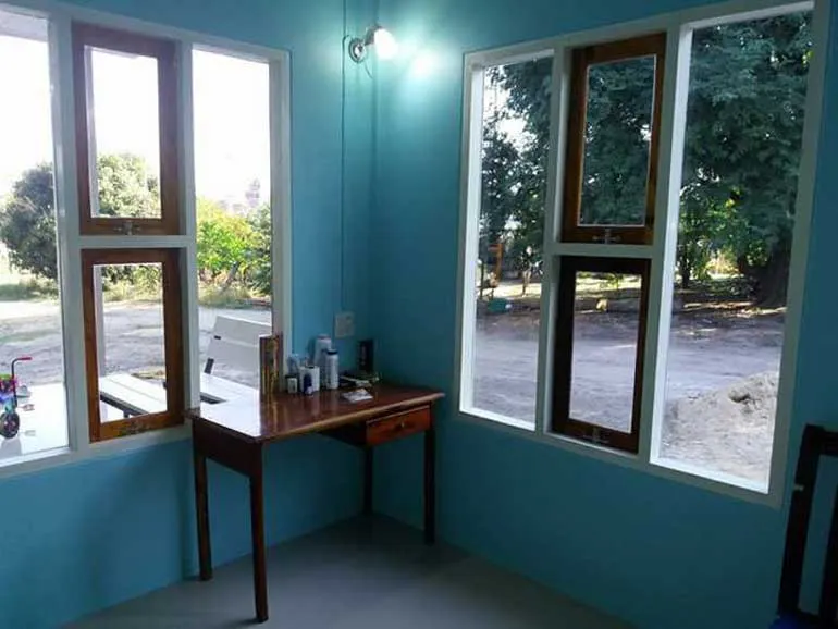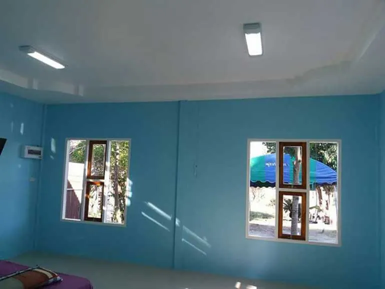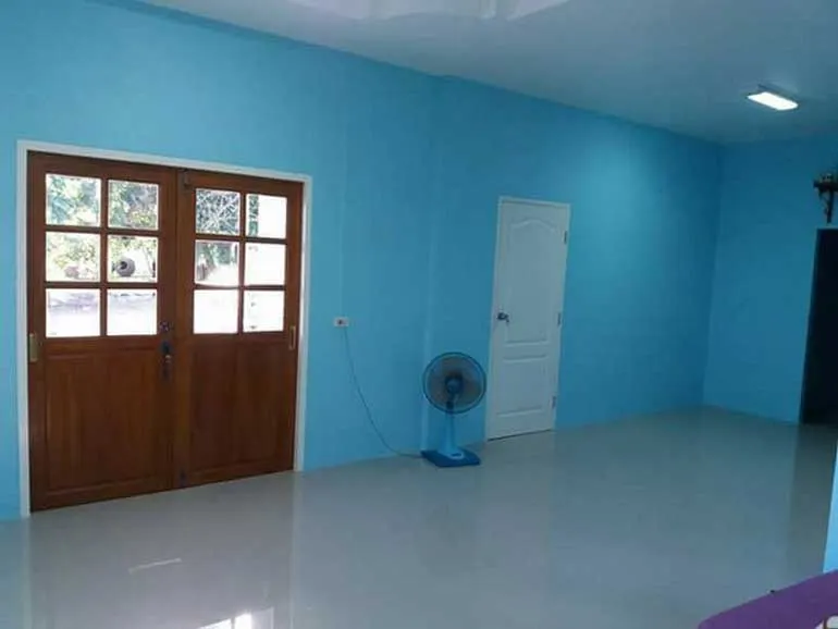 ภายในตกแต่งด้วยสีฟ้าอ่อนให้ความสว่างและสดใส และที่ให้ความโล่งโปร่งกัยตัวบ้านก็คือ เพดานสูง ที่ออกแบบมาเป็นอย่างดี พื้นบ้านใช้กระเบื้องสีขาวเรียบง่าย แบ่งสัดส่วนการใช้งานออกเป็น 3 ห้องนอน 1 ห้องน้ำ และมีห้องโถงสำหรับพักผ่อนด้วย บนพื้นที่ใช้สอยขนาด 120 ตารางเมตร งบประมาณก่อสร้างอยู่ที่ 520,000 บาท แต่อย่างที่บอกว่าอ่านให้จบ สาเหตุที่งบถูกแบบนี้เพราะลูกเขยเจ้าของบ้านเป็นช่างก่อสร้างน่ะครับ จึงลดค่าใช้จ่ายไปได้มากเลยทีเดียว
