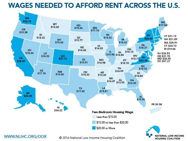 โดยรายงานชิ้นนี้ได้เน้นถึงค่าแรงขั้นต่ำในเมืองต่างๆทั่วสหรัฐอเมริกาที่โดยส่วนใหญ่จะต้องมีรายได้มากกว่า 2 เท่าตัวถึงจะสามารถเอาตัวรอดในการชำระค่าที่พักอาศัยได้ ซึ่งบางแห่งมีตัวเลขที่ไม่สูงมากเช่นชิคาโก้ ค่าแรงขั้นต่ำ 11 เหรียญต่อชม. ค่าเช่าที่พัก 1 ห้องนอนจะต้องทำได้ 20 เหรียญต่อชม.