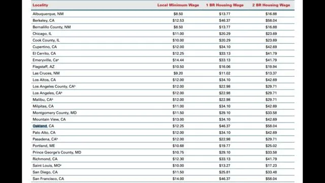 กลับพบว่าการจะเช่าที่พักอาศัย 1 ห้องนอนจะต้องทำเงินมากกว่าความเป็นจริงในหลายๆ เมืองในสหรัฐอเมริกา ตัวอย่างเช่น ค่าแรงขั้นต่ำในเมืองเบิร์กเลย์อยู่ที่ 12 เหรียญต่อชมและที่ซานฟรานซิสโก 14 เหรียญต่อชม. แต่ความเป็นจริงแล้วการเช่าอพาร์ทเม้นต์ 1 ห้องนอนในสองเมืองนี้ จะต้องมีค่าแรงขั้นต่ำสูงถึง 46 เหรียญต่อชม. และหากต้องการอพาร์ทเม้นต์ 2 ห้องนอน จะต้องมีรายได้ 58 เหรียญ หรือประมาณ 2พันบาท ต่อชม.