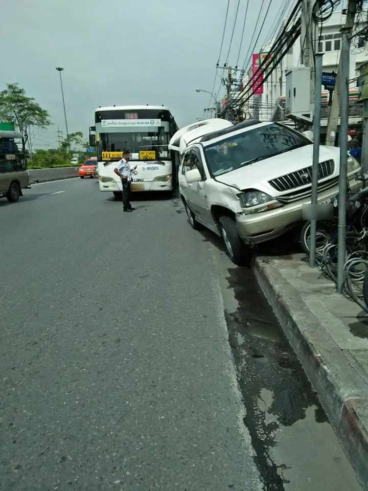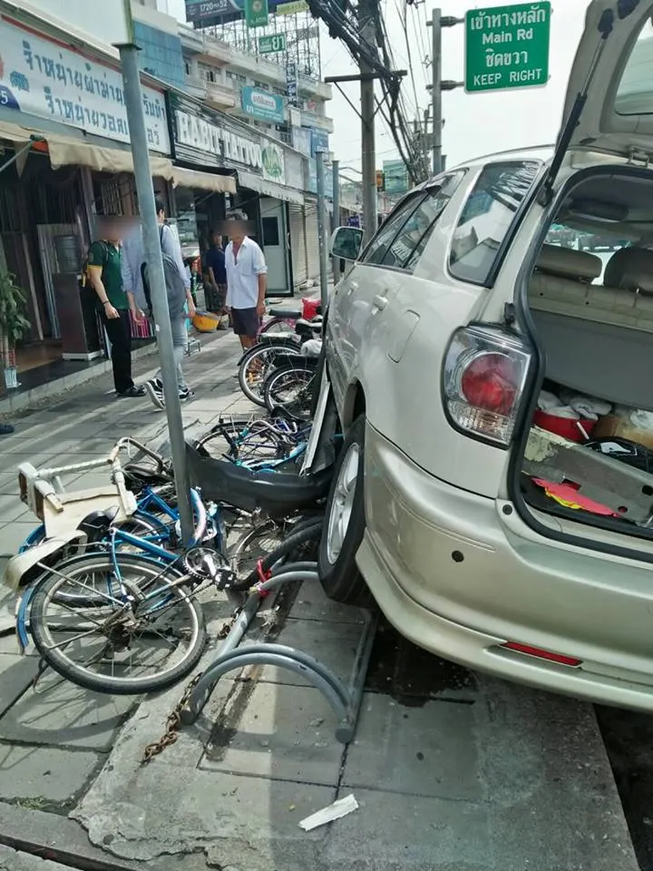 รถเมล์ ชนกับรถยนต์ แล้วรถยนต์ เสียหลักปีนขึ้นฟุตบาทชนจักรยานที่จอดอยู่หลายคัน