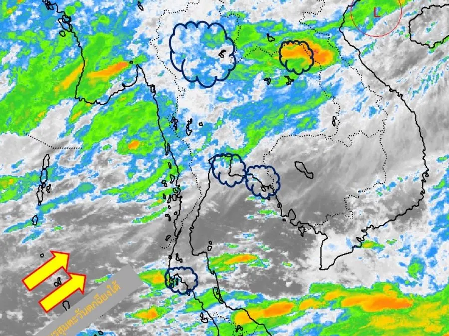 ภาคใต้ (ฝั่งตะวันออก) มีฝนฟ้าคะนอง ร้อยละ 40 ของพื้นที่ ส่วนมากบริเวณจังหวัดชุมพร สุราษฎร์ธานีนครศรีธรรมราช พัทลุง สงขลา ปัตตานี ยะลา และนราธิวาส อุณหภูมิต่ำสุด 24-26 องศาเซลเซียสอุณหภูมิสูงสุด 33-36 องศาเซลเซียส ลมตะวันตกเฉียงใต้ ความเร็ว 15-30 กม/ชม. ทะเลมีคลื่นสูงประมาณ 1 เมตร ห่างฝั่งคลื่นสูง 1-2 เมตร