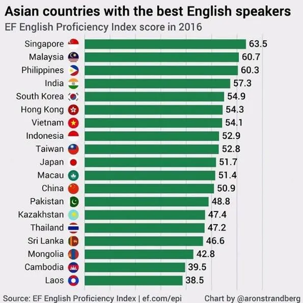 โดยประเทศที่ใช้ภาษาอังกฤษได้ดีที่สุดในเอเชียอันดับหนึ่ง คือ สิงคโปร์ได้คะแนน 63.52 ซึ่งอยู่ในระดับที่สูงมาก ตามมาด้วยอันดับสองมาเลเซียและอันดับสามฟิลิปปินส์