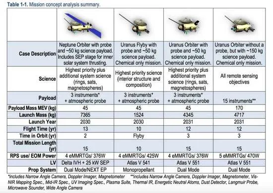 โครงการทั้ง 4 แบบตามรูปมีทั้งแบบส่งยาน orbiter ไปโคจร และแบบบินผ่านรอบเดียว หรือ flyby มีทั้งแบบที่นำยานเล็กหรือ probe ไปด้วยเพื่อใช้ทิ้งลงไปสำรวจบรรยากาศดาว กับแบบที่ไม่มียาน probe โดยหากเลือกจะไปยูเรนัส ช่วงเวลาที่เหมาะสมคือปี 2030 ถึง 2034 แต่หากเลือกไปเนปจูนก็จะเป็นช่วงปี 2029 ถึง 2030 โดยเลือกจากระยะทางที่โคจรเข้ามาใกล้โลก ซึ่งอย่างไรก็ตามเส้นทางเดินของยานอวกาศก็จะต้องตรงไปทำสลิงช็อตจากดาวพฤหัสก่อนเพื่อเป็นการประหยัดพลังงานและได้ความเร็วเพิ่มขึ้น