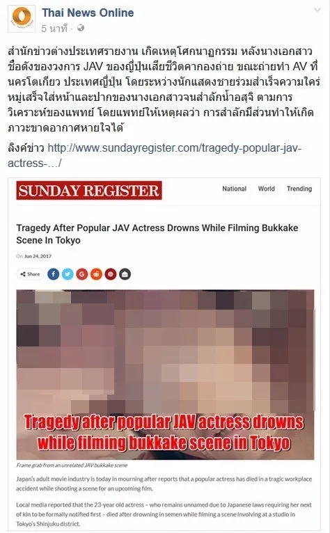 สำนักข่าวต่างประเทศรายงาน เกิดเหตุโศกนาฏกรรม หลังนางเอกสาวชื่อดังของวงการ JAV ของญี่ปุ่นเสียชีวิตคากองถ่าย ขณะถ่ายทำ AV ที่นครโตเกียว ประเทศญี่ปุ่น โดยระหว่างนักแสดงชายร่วมสำเร็จความใคร่หมู่เสร็จใส่หน้าและปากของนางเอกสาวจนสำลั