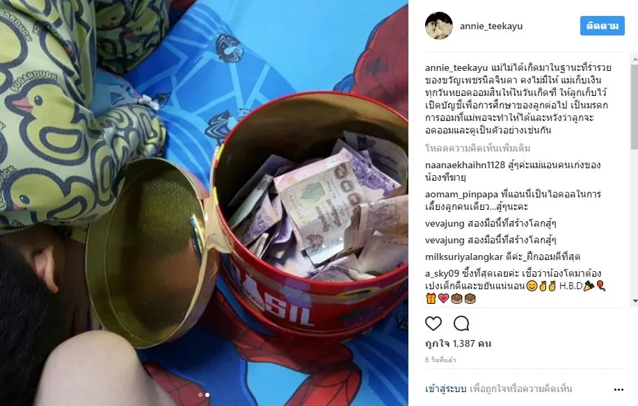 “แม่ไม่ได้เกิดมาในฐานะที่ร่ำรวย ของขวัญเพชรนิลจินดา คงไม่มีให้ แม่เก็บเงินทุกวันหยอดออมสินให้ในวันเกิดฑี ให้ลูกเก็บไว้เปิดบัญชีเพื่อการศึกษาของลูกต่อไป เป็นมรดกการออมที่แม่พอจะทำให้ได้และหวังว่าลูกจะอดออมและดูเป็นตัวอย่างเช่นกัน”