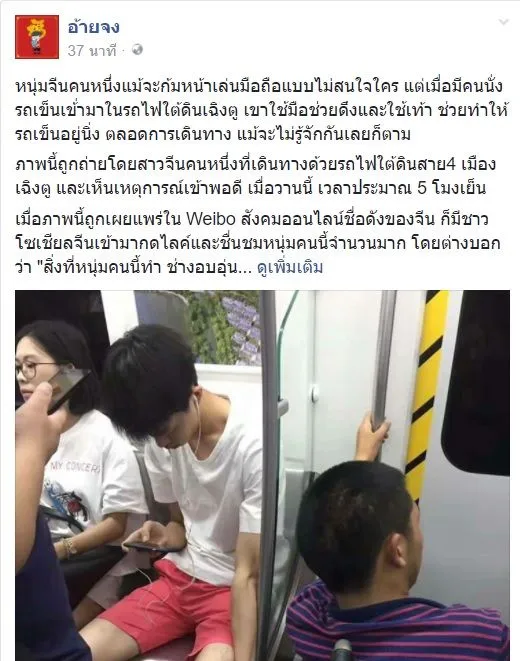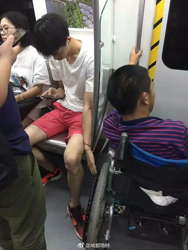 โดยโพสท์ระบุว่า "หนุ่มจีนคนหนึ่งแม้จะก้มหน้าเล่นมือถือแบบไม่สนใจใคร แต่เมื่อมีคนนั่งรถเข็นเข้่ามาในรถไฟใต้ดินเฉิงตู เขาใช้มือช่วยดึงและใช้เท้า ช่วยทำให้รถเข็นอยู่นิ่ง ตลอดการเดินทาง แม้จะไม่รู้จักกันเลยก็ตาม ภาพนี้ถูกถ่ายโดยสาวจีนคนหนึ่งที่เดินทางด้วยรถไฟใต้ดินสาย 4 เมืองเฉิงตู และเห็นเหตุการณ์เข้าพอดี เมื่อวานนี้ เวลาประมาณ 5 โมงเย็น
