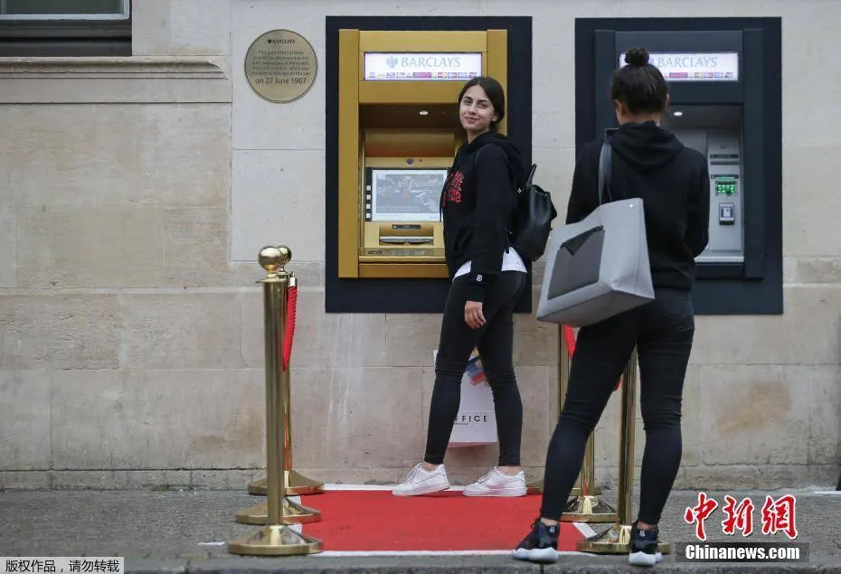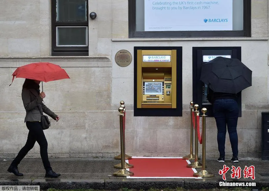 วานนี้ (27 มิ.ย.) ธนาคารบาร์เคลย์ สาขาเอ็นฟิลด์ ในกรุงลอนดอน ซึ่งเป็นผู้ให้บริการตู้เอทีเอ็มเครื่องแรกของโลก ได้จัดกิจกรรมพิเศษเล็กๆ เพื่อฉลองการใช้งานตู้เอทีเอ็มเครื่องแรกของโลกครบ 50 ปี โดยจัดการปูพรมแดงพร้อมราวกั้นและเจ้าหน้าที่รักษาความปลอดภัยในชุดสีฟ้าสดใสดึงดูดความสนใจจากผู้คนท้องถิ่น