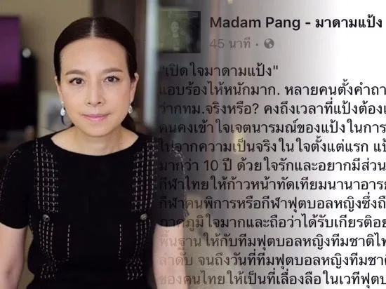 "เปิดใจมาดามแป้ง แอบร้องไห้หนักมาก. หลายคนตั้งคำถามว่า แป้งจะลงสมัครผู้ว่ากทม.จริงหรือ? คงถึงเวลาที่แป้งต้องเปิดใจ ไม่เช่นนั้นหลายคนคงเข้าใจเจตนารมณ์ของแป้งในการทำทีมฟุตบอลเบี่ยงเบนไปจากความเป็นจริงในใจตั้งแต่แรก แป้งอยู่ในวงการกีฬามากว่า 10 ปี ด้วยใจรักและอยากมีส่วนร่วมในการพัฒนาวงการกีฬาไทยให้ก้าวหน้าทัดเทียมนานาอารยประเทศ ไม่ว่าจะเป็นกีฬาคนพิการหรือกีฬาฟุตบอลหญิงซึ่งถือเป็นช่วงเวลาที่แป้งภาคภูมิใจมากและถือว่าได้รับเกียรติอย่างสูง ที่ได้เริ่มต้นวางพื้นฐานให้กับทีมฟุตบอลหญิงทีมชาติไทยจนพัฒนาขึ้นตามลำดับ จนถึงวันที่ทีมฟุตบอลหญิงทีมชาติไทยได้ประกาศศักดิ์ศรีของคนไทยให้เป็นที่เลื่องลือในเวทีฟุตบอลโลก วันนี้นอกจากทีมฟุตบอลหญิงทีมชาติไทย #ทีมลูกรัก แป้งหันมาบริหารทีมฟุตบอลชายด้วย นั่นคือสโมสรการท่าเรือ เอฟ.ซี. ก็ด้วยความชื่นชอบและหลงใหลในกีฬาฟุตบอล หวังจะเป็นส่วนหนึ่งของการร่วมพัฒนาวงการกีฬาฟุตบอลไทย ให้คนไทยได้สนุกไปกับการแข่งขันในแต่ละเกมส์ ตลอดหลายปีที่ผ่านมา แป้งทุ่มเททำงานอย่างหนัก เพื่อพัฒนาศักยภาพของนักกีฬาทุกด้าน เพื่อให้ทีมแข็งแกร่ง สร้างผลงาน ทำให้แฟนบอลมีความสุขกับการเชียร์ทีมที่ตนรัก"