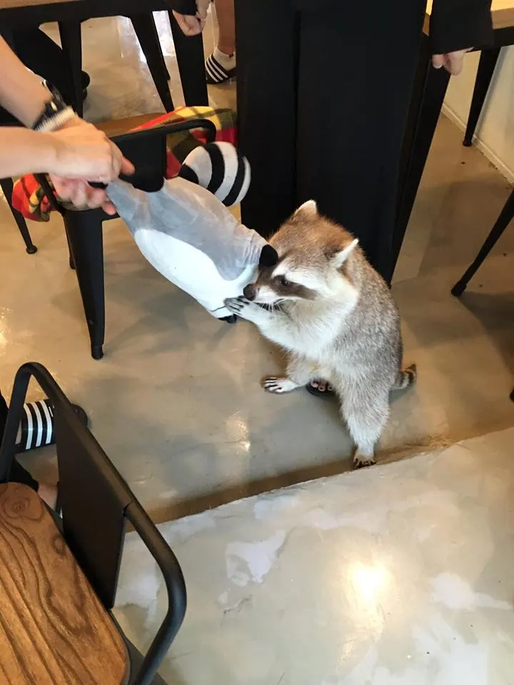 ภาพความน่ารักนี้เป็นเหตุการณ์ที่เกิดขึ้นในประเทศญี่ปุ่น ได้รับการเผยแพร่ผ่านทางเว็บไซต์ theqoo โดยในภาพนั้นเห็นได้ว่ามีผู้หญิงคนหนึ่งที่ยื่นตุ๊กตาหมีให้กับแร็กคูน และเหมือนเธอพยายามจะขอคืน แต่แร็กคูนก็ไม่ยอมปล่อยไปง่าย ๆ จนตุ๊กตาหมีตกไปอยู่ในมือของแร็กคูน