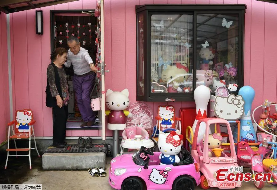 มาซาโอะ กันจิ อดีตเจ้าหน้าที่ตำรวจวัยเกษียณ ยิ้มแฉ่งขณะถ่ายรูปกับของสะสมแสนรักอย่างฮัลโหล คิตตี้ ภายในบ้านพักที่ก็ถูกแปรสภาพเป็นรังฮัลโหล คิตตี้ สีชมพูหวานแหวว ในเมืองโยสึไกโดะ จังหวัดชิบะ ประเทศญี่ปุ่น เมื่อวันที่ 28 มิ.ย. ที่ผ่านมา