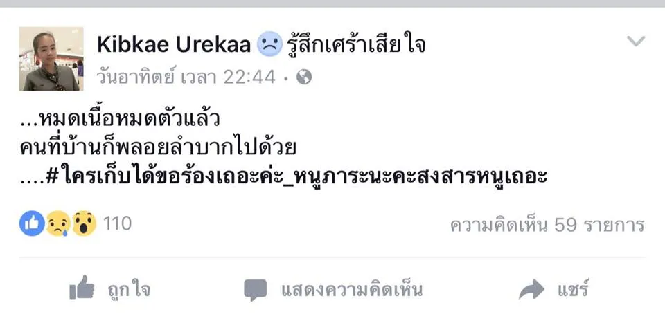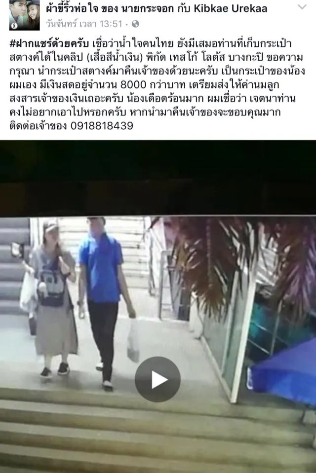 เฟซบุ๊ค ผ้าขี้ริ้วห่อใจ ของ นายกระจอก ฝากแชร์คลิปชายเสื้อน้ำเงินที่เก็บกระเป๋าเงินของน้องตนที่หล่นไว้ บริเวณ โลตัส บางกะปิ มีเงินสดในกระเป๋า 8 พันบาท ฝากแชร์ไปให้ถึงคนเก็บให้เอากระเป๋าเงินมาคืนด้วย โดยโพสท์ระบุว่า ..