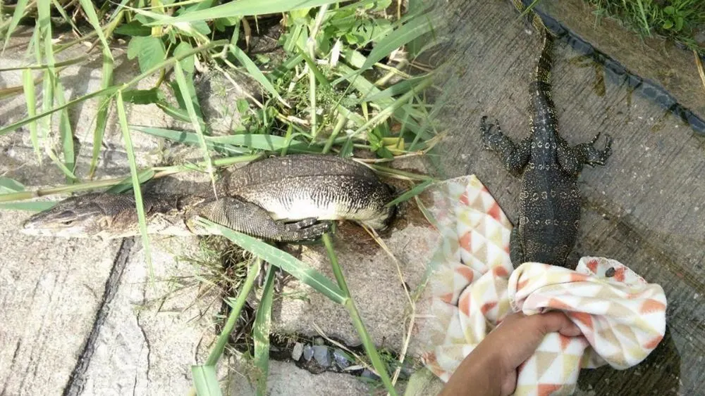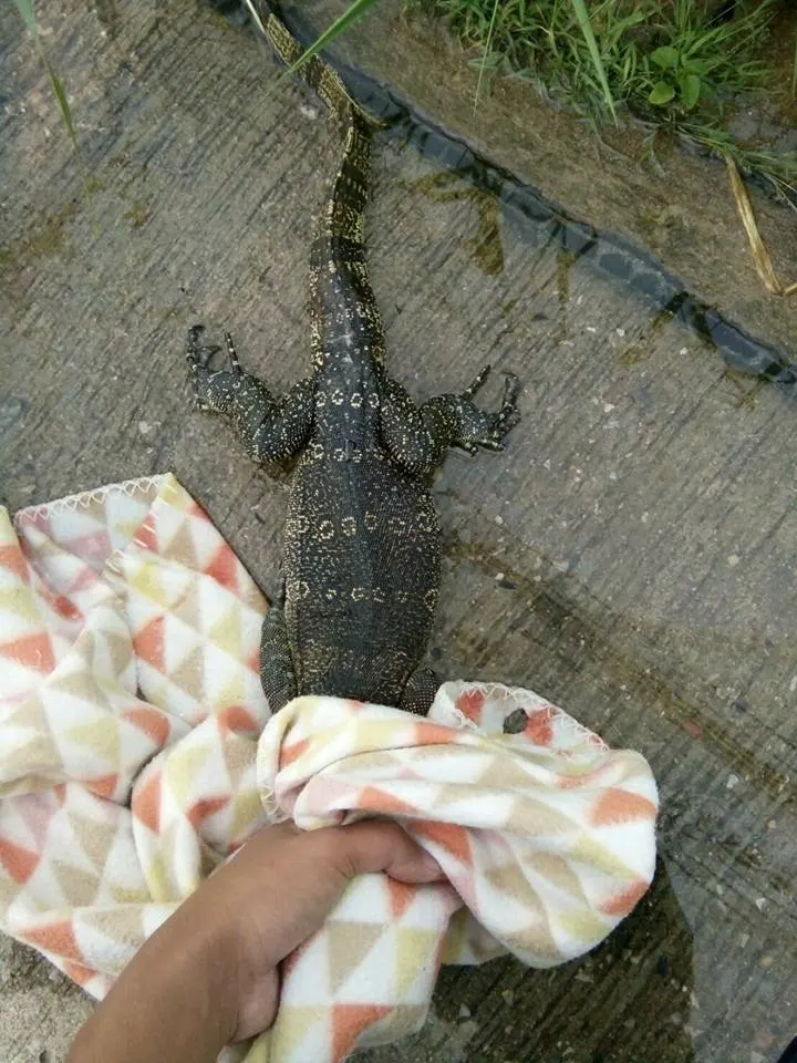 พลเมืองดี ช่วยกันนำน้ำมันเครื่องทาลำตัวให้ตัวเงินตัวทองที่ติดรูฝาท่อปูน ถ.สุขาภิบาล 5 แยกซ.10/3 ก่อนดึงออกมาจนปลอดภัย หลังออกมาได้ เจ้าตัวเงินตัวทองตกใจวิ่งเข้าป่าหญ้าทันที..