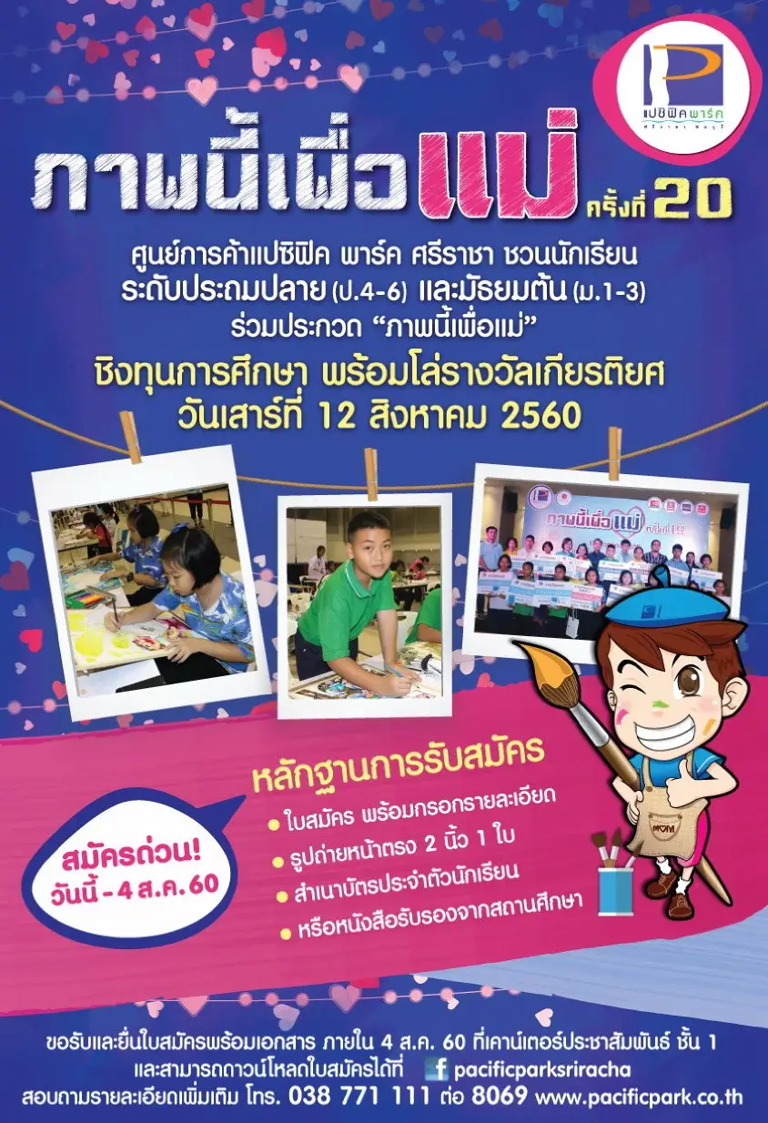 - ขอเชิญร่วมเป็นกำลังใจให้กับน้องๆนักเรียนที่เข้าแข่งขันการประกวดวาดภาพ ในหัวข้อ“ ภาพนี้เพื่อแม่ ครั้งที่ 20 ” ณ แปซิฟิค ฮอลล์ ชั้น 4 ได้ในวันเสาร์ที่ 12 สิงหาคม 2560 ตั้งแต่เวลา 00 น. ศูนย์การค้าแปซิฟิค พาร์ค ศรีราชา