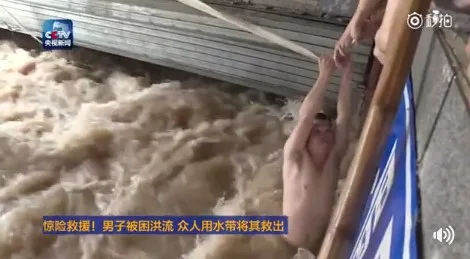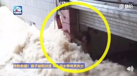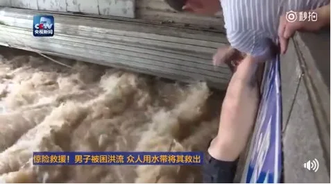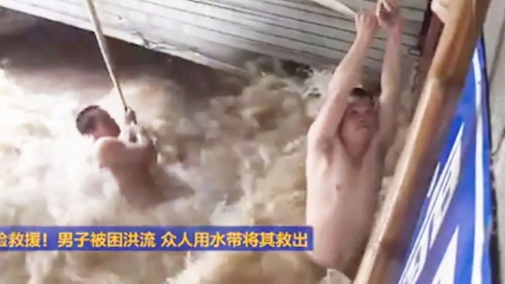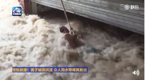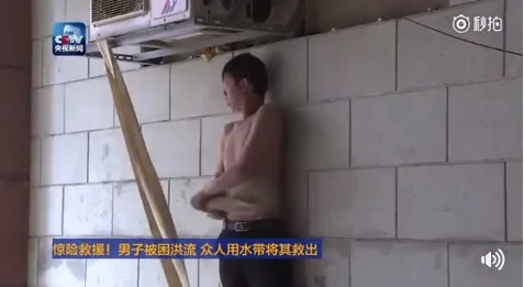 หวงซูอวี่ เพื่อนร่วมงานที่อยู่ในเหตุการณ์ รีบเดินไปที่หลังคาของโรงรถ ผูกสายยางดับเพลิงไว้กับเอวของตัวเองแล้วให้เพื่อนกลุ่มที่ยืนอยู่ที่ระเบียงอีกฝั่งที่น้ำท่วมไม่ถึงช่วยกันดึงสายไว้ จากนั้นจึงหย่อนสายยางลงไปในน้ำให้ชายคนนี้จับ เพื่อให้เขาโหนเชือกไปยังระเบียงอีกฝั่ง ด้วยความพยายามของเพื่อนคนงานที่ช่วยกันออกแรงดึง ชายคนดังกล่าวจึงถูกช่วยขึ้นมาได้อย่างปลอดภัยในที่สุด
