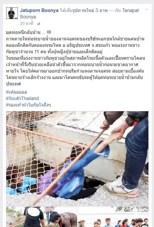 7 กค. 60 มีรายงานข่าวว่า แรงงานชาวกัมพูชา 11 คน มีทั้งผู้ชาย ผู้หญิง และเด็กเล็ก มุดท่อระบายน้ำบริเวณลานจอดรถ ของบริษัทเอกชนแห่งหนึ่ง ใกล้ชายแดน อ.อรัญประเทศ จ.สระแก้ว เจ้าหน้าที่รีบช่วยเหลือขึ้นมาจากท่อระบายน้ำอย่างเร่งด่วน สภาพแต่ละคนอิดโรยเนื้อตัวมอมแมม