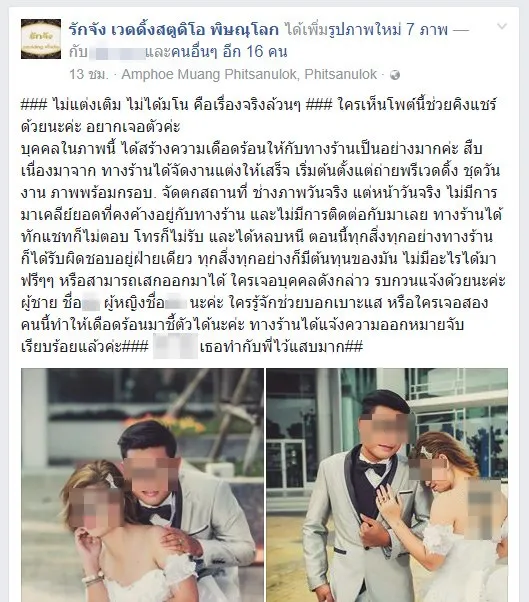 ร้านเว้ดดิ้งขอเพจดังช่วยเหลือ หลังจากถูกคู่บาวสาวมาใช้แพคเกจงานแต่งแล้วเบี้ยว ติดต่อไม่ได้ โดยได้ขอความช่วยเหลือไปที่เพจ Social Hunter ว่า