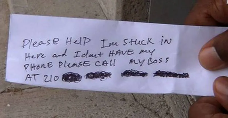 โดยชายคนที่ว่านี้เป็นช่างกุญแจ ต้องมาเปลี่ยนกุญแจล๊อกตู้ ATM แต่พลาดทำให้ตัวเองติดอยู่ด้านใน แล้วโทรศัพท์ก็ลืมไว้ในรถ จนปัญญาจะร้องให้คนช่วย จึงใช้วิธีเขียนข้อความขอความช่วยเหลือ ให้ลูกค้าที่เข้ามากดเงินสดช่วยโทรไปแจ้งเจ้านายให้เอากุญแจมาช่วยเปิดตู้ พร้อมกับเขียนเบอร์โทรฯเจ้านายใส่ในสลิปให้ด้วย