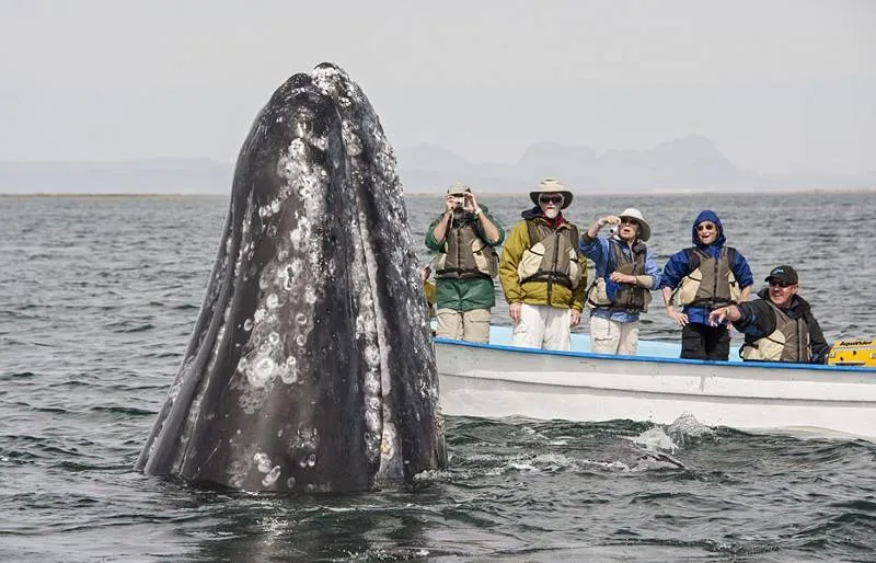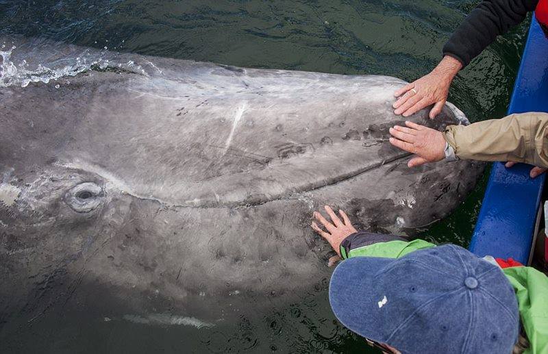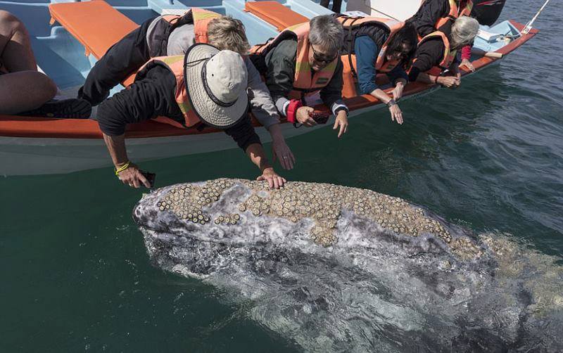 กลุ่มนักท่องเที่ยวตื่นตาตื่นใจกับประสบการณ์พบปะเหล่ายักษ์ใหญ่แห่งท้องทะเล โดยแม่วาฬพร้อมลูกของมันอีกสองตัว ได้แหวกว่ายขึ้นมาให้นักท่องเที่ยวสัมผัสทักทายอย่างใกล้ชิด บริเวณนอกชายฝั่งซาน อิกนาซิโอ ลากูน ในรัฐบาฮา แคลิฟอร์เนีย ทางเหนือสุดและตะวันตกสุดของประเทศเม็กซิโก เมื่อไม่นานนี้