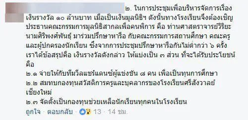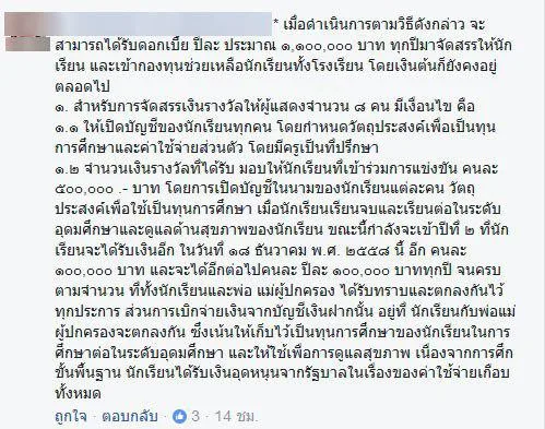 โดยเรื่องนี้ถูกตีแผ่ในเพจชื่อดัง แหม่มโพธิ์ดำ ที่ออกมาโพสต์ข้อความดังนี้ “วีลแชร์แดนซ์” จากโรงเรียนแห่งหนึ่งใน จ.เชียงใหม่ ซึ่งในทีมประกอบไปด้วยสมาชิก 8 คน ครั้งนั้น (ปี 2557) พวกเขาได้รับเงินรางวัล 10 ล้านบาท แต่ ณ วันนี้กลับมีความจริงจากปาก 1 ใน 8 จากทีมวีลแชร์แดนซ์ บอกว่า ทาง ผอ. จัดสรรเรื่องเงินรางวัลให้ปีละ 1 แสน และจะจ่ายให้เป็นเวลา 5 ปี เท่ากับว่า ทุกคนในทีมจะได้รางวัลคนละ 5 แสนบาท”