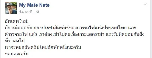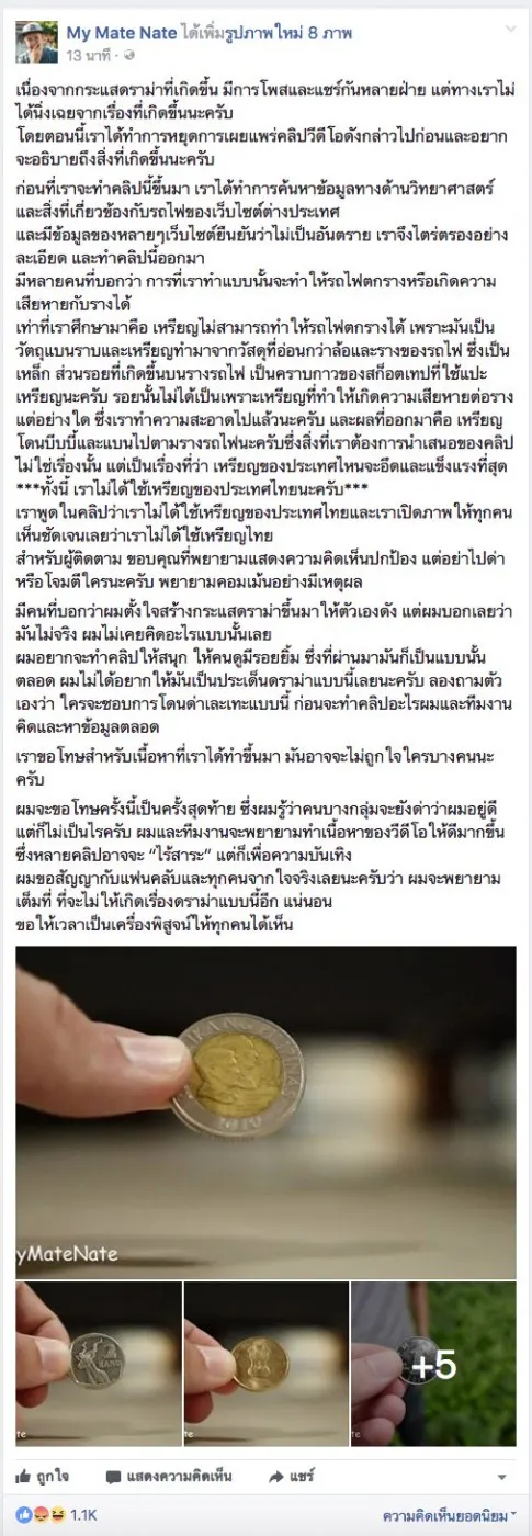 จบได้ไหม? My Mate Nate ชี้แจงแล้ว เหรียญไม่ทำให้รถไฟตกราง - ไม่ได้ใช้เหรียญไทย พร้อมขอโทษที่ทำให้ไม่พอใจ