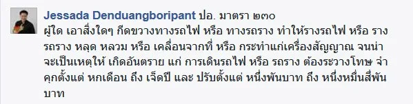 เป็นการกระทำที่ผิดกฎหมาย ตามพระราชบัญญัติจัดวางการรถไฟและทางหลวง พ.ศ. 2464 ที่ระบุว่า 'ห้ามผู้ใดผู้หนึ่งที่ไม่มีหน้าที่ มากระทำการบนพื้นที่การรถไฟทั่วประเทศ ' จะได้รับโทษทั้งทางแพ่งและอาญา เพราะสร้างความเสียหายให้กับทรัพย์สินทางราชการ