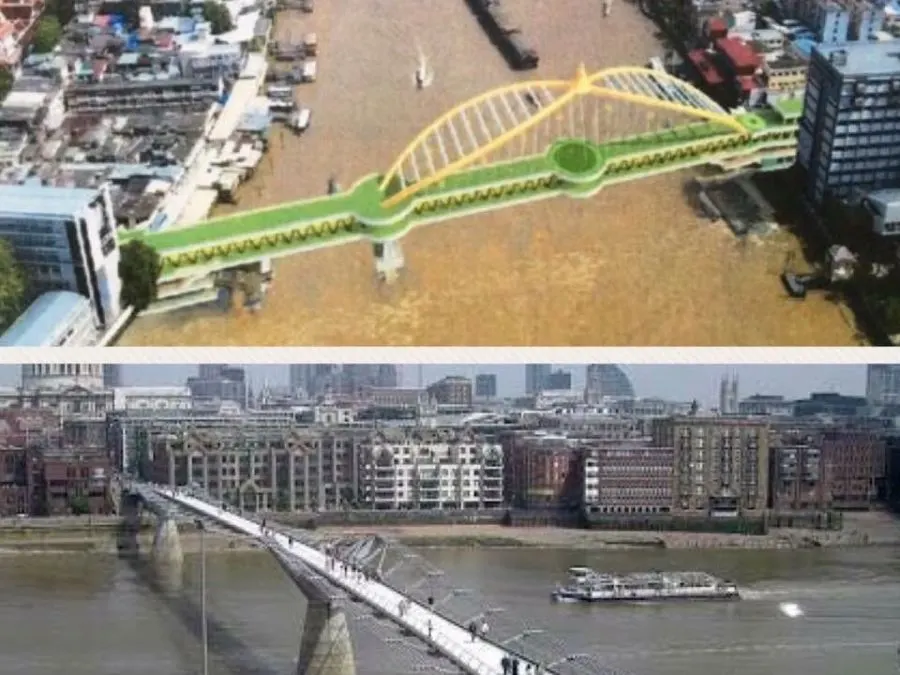 9 กรณีศึกษา สะพานเมลิเนียมที่กรุงลอนดอน(ภาพล่าง) ความยาว325 เมตร เงินลงทุน 970ล้านบาท(เมื่อ 17 ปีที่แล้ว)นั้นเป็นส่วนหนึ่งของการเฉลิมฉลองการเข้าสู่ปี ค.ศ.2000 ที่สำคัญเป็นหนึ่งในแผนแม่บทของการฟื้นฟูเมืองเพื่อดึงการพัฒนาและกิจกรรมของเมืองอีกฝั้งหนึ่งสู่อีกฝั่งหนึ่งโดยวางแผนการเชื่อมต่อการสัญจรและการใช้ประโยชน์ที่ดินควบคู่กันไป โดยแนวคิดของการออกแบบนั้นให้มีลักษณะบางเบาเพื่อลดผลกระทบต่อการเป็นสิ่งแปลกปลอมกับภูมิทัศน์เมืองโดยรอบ และให้คนที่อยู่บนสะพานสามารถเห็นทิวทัศน์เมืองได้อย่างชัดเจน