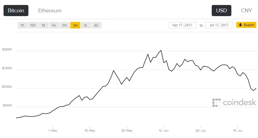 นี่อาจหมดสัญญาณของการตื่นสกุลเงิน cryptocurrency (อย่างน้อยก็ในรอบนี้) เมื่อราคา Bitcoin ยังร่วงลงมาอย่างต่อเนื่อง หลังจากทำสถิติสูงสุดที่ 3,000 ดอลลาร์ในเดือนมิถุนายน ตอนนี้ราคาตกลงมาต่ำกว่าระดับ 2,000 ดอลลาร์แล้ว เทียบเท่ากับขาขึ้นในเดือนพฤษภาคม (ขณะที่เขียนข่าวนี้ ราคาอยู่ที่ 1,994 ดอลลาร์)