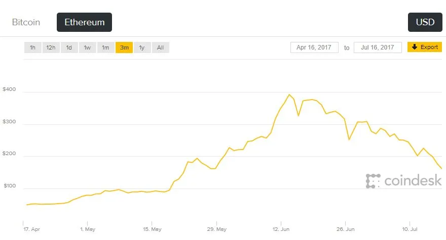 ส่วนสกุลเงิน Ethereum ก็ไปในทิศทางเดียวกัน จากที่ขึ้นไปสูงสุด 391 ดอลลาร์ในช่วงกลางเดือนมิถุนายน ราคาปัจจุบันอยู่ที่ 164 ดอลลาร์ ตกลงมาเกินครึ่งของมูลค่าสูงสุด