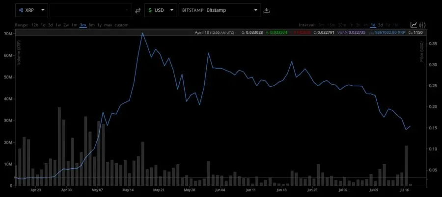 สกุลเงินอันดับสาม XRP (Ripple) ขึ้นไปสูงสุดที่ 0.39 ดอลลาร์ในเดือนพฤษภาคม ตอนนี้ราคาอยู่ที่ 0.14 ดอลลาร์