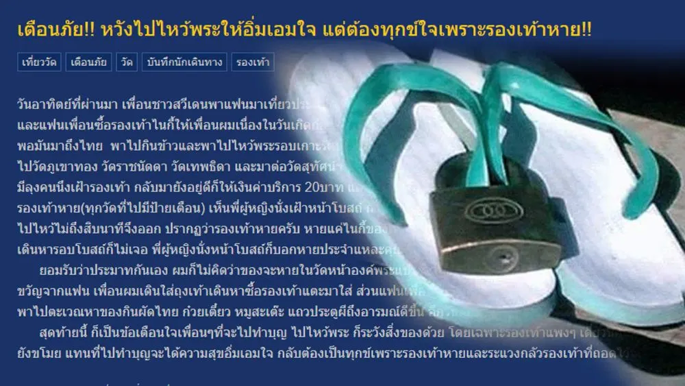 สมาชิกเวบไซต์พันทิปคุณ Ronin~[indies] ได้โพสท์เตือนชาวเน็ตให้ระวังหากเข้าวัดจะพบปัญหาคลาสิคที่มีมาอย่างยาวนาน คือ ตั้งใจจะไปไหว้พระให้อิ้มเอมใจ แต่กลับต้องมาทุกข์ใจเพราะรองเท้าหายซะนี่.... โดยได้โพสท์เล่าว่า....