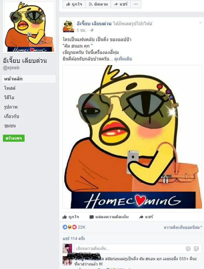 เมื่อวันนี้ 19/7/2560 ทางเฟซบุ้ค ของ Eเจี้ยบเลียบด่วน ได้เปลี่ยนรูปโปร์ไฟล์ เป็นไก่ที่สวมจีจร และใส่แว่นตาดำ พร้อมถือกระเป๋าแบรนด์เนม และโทรศัพท์ไอโฟน คล้าย หลวงปู่ เณรคำ พร้อมทั้งแคปชั่นว่า