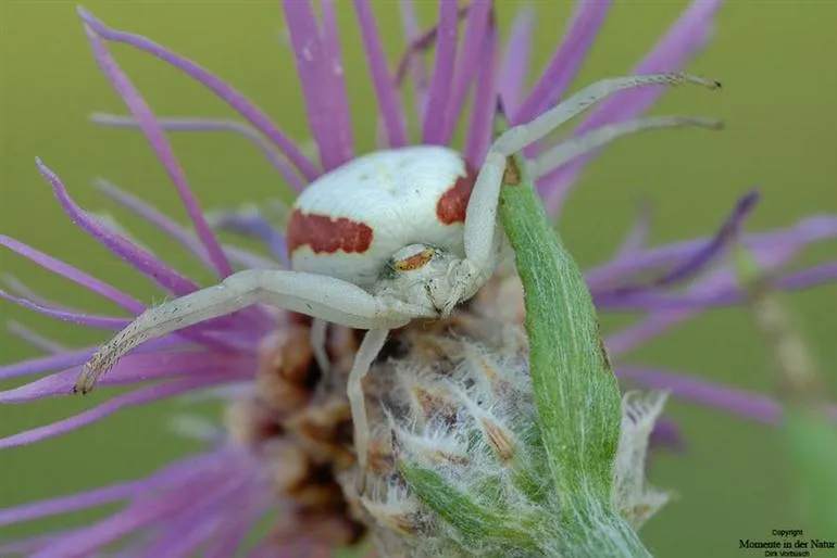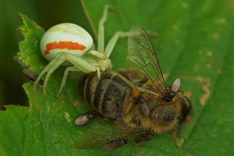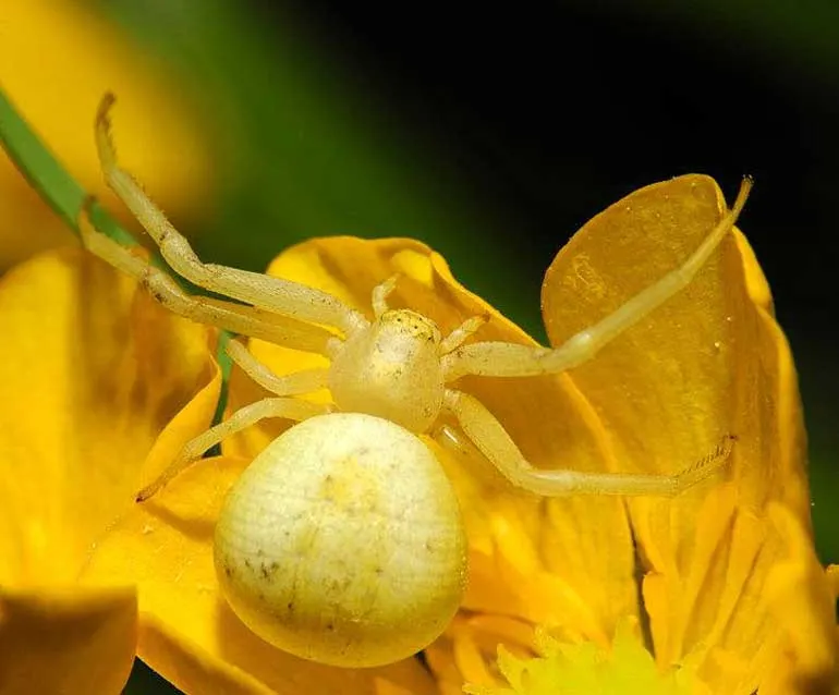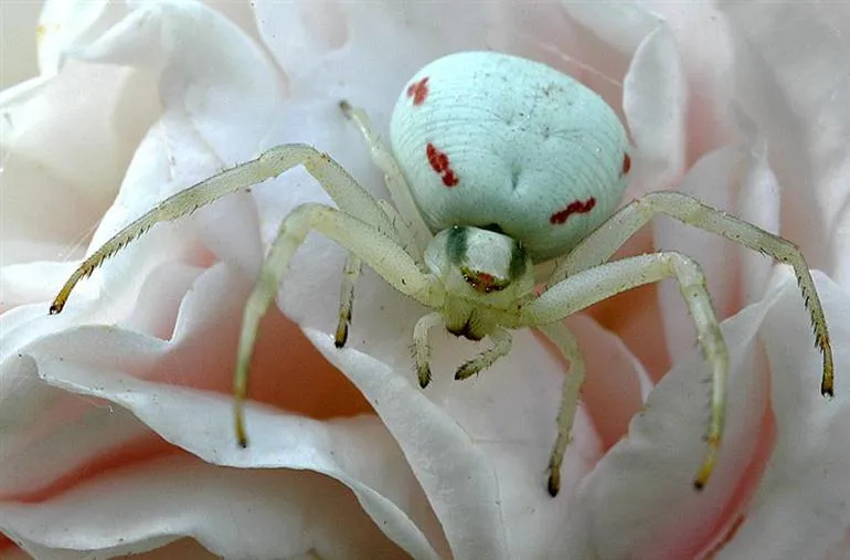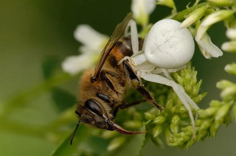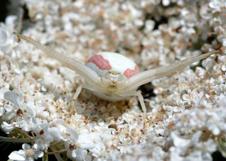 นี่คือ แมงมุมดอกไม้ หรือ White Crab Spider เป็นสัตว์พื้นเมืองในอเมริกาเหนือ พวกมันมักจะซ่อนตัวอยู่ตามดอกำม้ เพื่อล่าเหยื่อ สามารถจับเหยื่อที่มีขนาดใหญ่กว่าตัวเองได้ รวมไปถึงสัตว์ที่บินได้เช่นผึ้ง ผีเสื้อ พวกมันเป็นแมงมุมที่สามารถเปลี่ยนสีได้ โดยมันจะเปลี่ยนไปตามสภาพแวดล้อมที่อาศัยอยู่ สามารถเปลี่ยนจากสีขาวเป็นสีเหลืองได้ โดยการปล่อยเม็ดสีเหลืองไปยังผิวหนัง