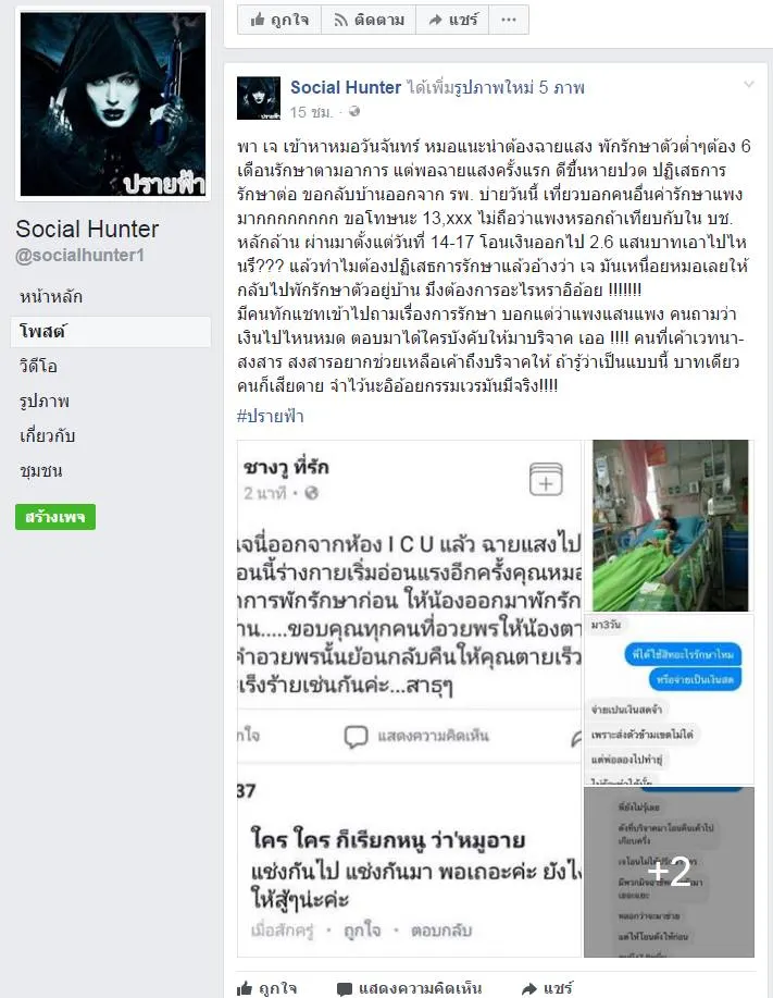 ยังคงเป็นประเด็นร้อน เมื่อ เพจดัง เปิดเผย ข้อมูล ของพี่สาวเจนี่ ที่น้องป่วยเป็นมะเร็ง แล้วชาวเน็ตบริจาคเงินช่วยเหลือนับล้านแต่ไม่ได้รักษา อ ล่าสุด 19/7/2560 ทางเพจ Social hunter ก็ได้ออกมาโพสต์ ข้อความที่ตามรายละเอียดด้านล่าง