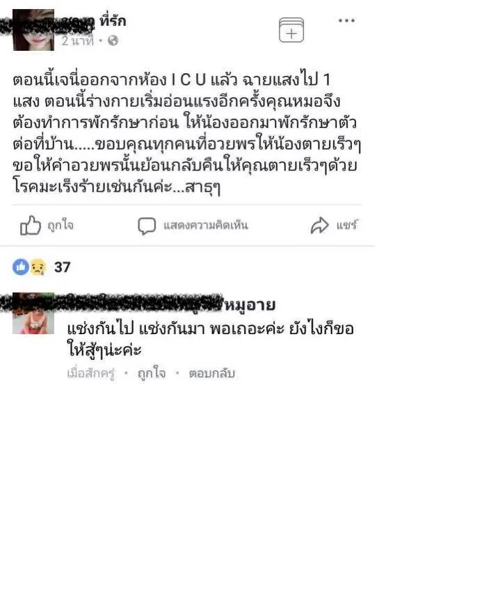 มีคนทักแชทเข้าไปถามเรื่องการรักษา บอกแต่ว่าแพงแสนแพง คนถามว่าเงินไปไหนหมด ตอบมาได้ใครบังคับให้มาบริจาค เออ !!!! คนที่เค้าเวทนา- สงสาร สงสารอยากช่วยเหลือเค้าถึงบริจาคให้ ถ้ารู้ว่าเป็นแบบนี้ บาทเดียวคนก็เสียดาย จำไว้นะอิอ้อยกรรมเวรมันมีจริง!!!!