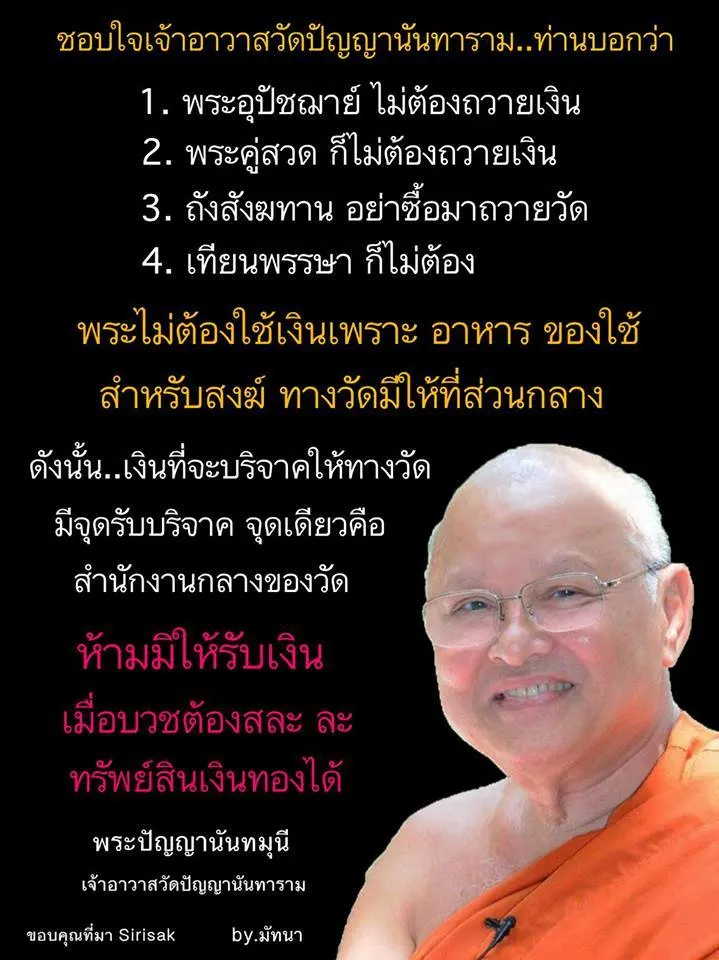 เหตุผล. ที่วัดปัญญานันทาราม พระไม่ต้องใช้เงิน. เพราะอาหาร. ของใช้สำหรับสงฆ์. ทางวัดมีให้ที่ส่วนกลาง. ดังนั้นเงินที่จะบริจาคให้ทางวัด. มีจุดรับบริจาคที่เดียวคือสำนักงานกลางของวัด. พระจะใช้ไปเบิกจากส่วนกลางห้ามมิให้รับเงิน. สิ่งของเป็นรายบุคคล. เมื่อบวชต้องสละ. ละ. ทรัพย์สินเงินทองได้